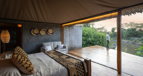 The estate houses up to 16 guests* in 5 suites, including a bunk room. The design blends masterful architecture with riverine forest and peaceful, welcoming safari aesthetic with views of the Mara River.